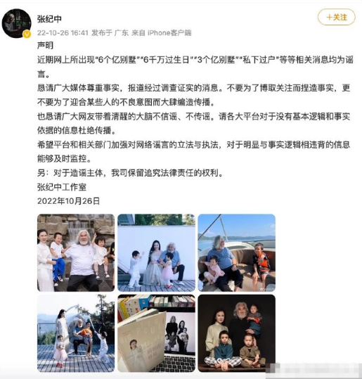 他明确表示,近期网络上所出现的 “6 千万过生日”“3 个亿别墅”“私下过户” 等等相关消息均为谣言,并不属实。