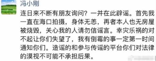但在14日,冯小刚就在朋友圈辟谣,称自己一直在拍摄,也没有房子被烧。